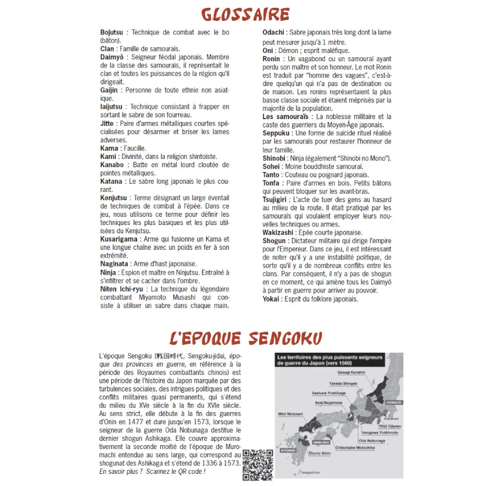 Pour jouer, vous n’aurez besoin que du livre, d’un crayon, d’une gomme et de deux dés à 6 faces (un de couleur sombre et un de couleur claire). Si vous n’avez pas de dés, un QR code au début du livre vous permettra d’accéder à un lanceur de dé en ligne avec deux dés de couleurs différentes. D’autres QR codes vous dirigeront vers des informations historiques ou des musiques pour davantage d’immersion dans vos parties ou pour télécharger à l’infini la feuille de personnage pour jouer et rejouer.